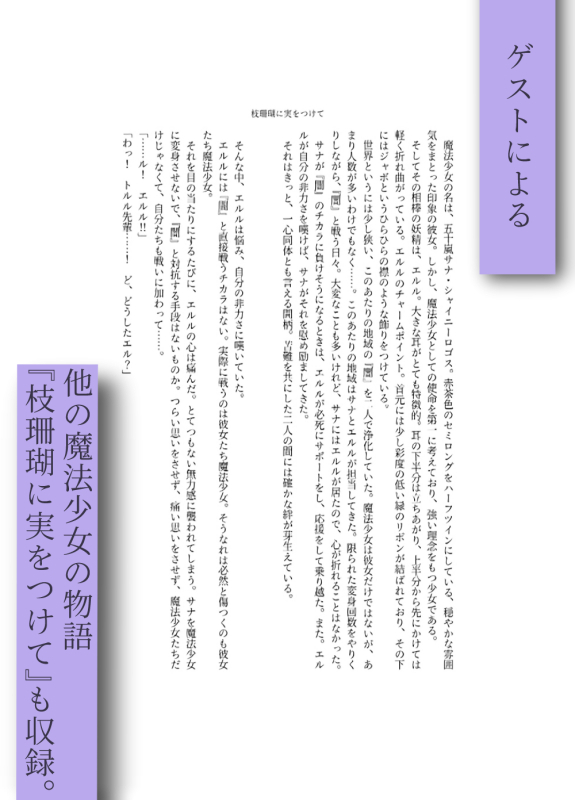 事前に世界設定をお渡しし、「この世界の魔法少女の可能性のひとつを書いてください。」という形で久慈らんちうさんにお願いした小説を収録しています。